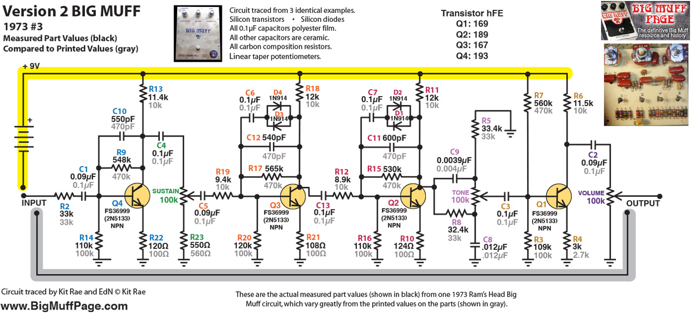 基板上の部品番号は Kit Rae さんの WEB サイト「The Big Muff π Page」の Evolution of the Big Muff Pi Circuit に掲載されているものと合わせてあります。このサイトには歴代の Big Muff Pi とその派生品の回路図があります。ここを参考にお好みのパラメータで作ってみてはいかがでしょうか。